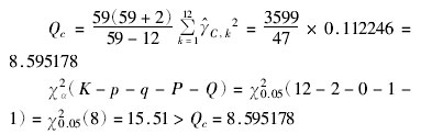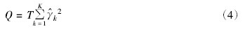 式中: ^γk为残差自相关系数;T为时间序列的观察值个数。统计量Q是均值为0方差为1/T的独立正态随机变量的平方和。Box和Pierce证明了其近似程度非常高,且统计量Q服从自由度为K-p-q的χ2分布。