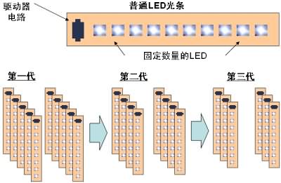 的LED。随着LED在光输出等方面性能的持续提升,要提供相同的总光能输出,就可以使用更少的LED光条,从而降低需要使用的LED的成本,参见图3。