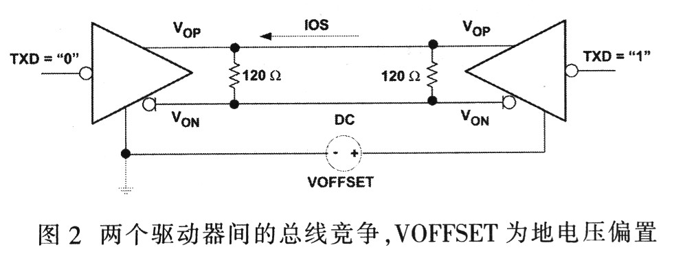 总线竞争属于数据传输总线故障,可能导致线路TSD触发。当挂接在一条数据总线上的两个或两个以上驱动器同时将总线驱动为相反状态时,则产生总线竞争,如图2所示。总线竞争是短路的另一种表现形式,一般是在两个或两个以上驱动器的总线引脚之间产生,而不是在总线引脚与电源之间或同一驱动器的总线引脚之间产生。地电压偏置VOFFSET会加剧总线竞争,地电压偏置越大,驱动器之间的电位差越高,则短路电流越大,短路电流超过门限时驱动器处入短路状态。短路电流门限越高,地电压偏置量恒定时器件结温越高,结温超过极限时TSD触发,同时调节器件结温。