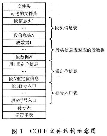 下面来分析COFF文件的结构,COFF文件从上到下中依次是文件头、可选的文件头、段头信息表、段头信息表对应的段数据、重定位信息、行号入口表、符号表、字符串表,如图1所示。其中第3~6项包含多个数据区,前4项与加载文件密切相关。