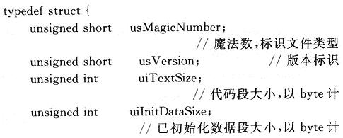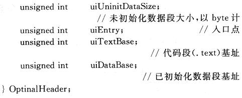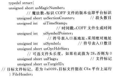 (2)可选头:可选头接在文件头的后面,也就是从COFF文件的Ox0014偏移处开始。长度可以为O。不同平台的可选头,长度和结构都不相同,TI DSP采用的可选头长度为28 B,用C的结构描述如下: