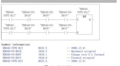 关键是检测滚床在运动状态下,CC09-RB048上的3个接近开关的触发顺序:若RB001的占位开关和CC09-RB048的前占位开关同时触发,表明车型为B12,RB048-TYPE-B12=“TRUE”;若CC09-RD026或者CC09-RD026的占位开关与CC09-RB048的后占位开关同时触发,表明车型非B12, RB048-TYPE-B12=“FALSE”。具体程序如图2所示。