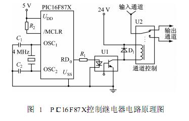 图1PIC16F87X控制继电器电路原理图当单片机的RD0引脚输出低电平时,光耦U1截止,继电器线圈两端无电位差,继电器衔铁释放,继电器常开触点释放,相当于开关断开;当单片机的RD0引脚输出高电平时,光耦U1饱和导通,24V电源加到继电器线圈两端,继电器吸合,其常开触点闭合,相当于开关闭合。