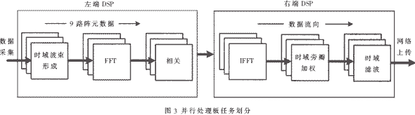 图2中,左端DSP为从DSP,通过其自身网口与接收换能器内的数据转换网络连接,根据显示速度要求,接收转换后的信号数据,并存储到其外围的SDRAM中。当接收到一帧信号数据时转入并行处理程序,左右两片DSP采用流水线并行处理方式。