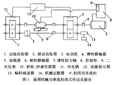 根据试验台的功率传递原理和加载方法的不同,试验台可分为开放式功率流式、封闭功率流式和电功率流闭式三大类。机械封闭功率流式试验台(如图1),由于可用小功率原动机与低的功耗进行大的功率试验,具有不需要安置耗能装置,节能等优点,而运用很广泛。在封闭系统中,功率一端流出,又从另一端流人,形成循环封闭流,因此只要从外界输入不多的能量便可保持系统运转。电动机供给的能量,主要是补偿封闭系统中各零部件在运转时的摩擦功率损失,其值约为封闭功率值的 10%~15%左右。
