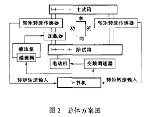试验台以一台高档工业控制计算机作为核心,配以单片机系统,分别对电机调速系统和液压加载系统进行控制。工控机不但是控制器,同时还具有记录仪、示波仪、动态信号分析仪等功能,还能方便地根据不同实验的需要设置不同的转速、转矩、温度等报警参数和失效判定指标。其总体设计方案见图2。