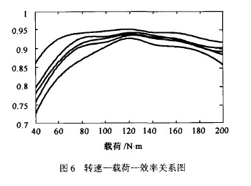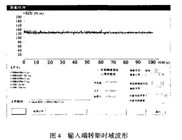 下面是采集负载恒为M=130N?m,减数器输入端N=1000r/min的转速信号的1k数据(如图4和图5),进行傅立叶变换或小波变换(略),可对系统进行分析和故障诊断。图6为在不同转速、不同负载下传动效率曲线图,图中曲线由上至下的输入转速分别为600r/min、800r/min、 1000r/min、1200r/min、1600r/min。