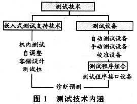 测试技术是指应用测试设备、工具和方法,按照标准,对装备的状况进行判断。内涵如图1,包含嵌入式测试支持技术、测试设备和测试程序等。