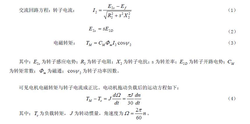 若附加反向电动势Ef 增大,转子电流I减小,电磁转矩TM 减小,若负载转矩T不变,由式(4)可见使转速减小,转速减小又使负载转矩Tc减小2(对于风机、泵类等大容量平方转矩负载c),重新获得转矩的平衡,稳定于新的转速运行,最终达到改变转速的目的。