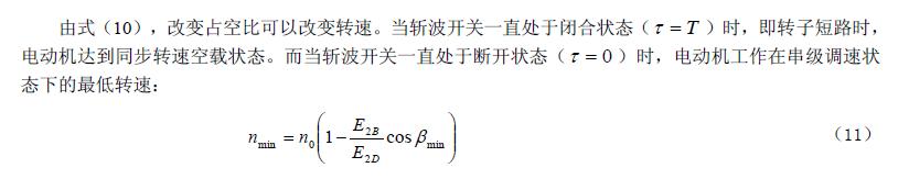 由此可见,斩波式串级调速运行规律为:当占空比越大,即斩波器的导通时间越长,转速越高;反之,则转速越低。并且可以达到足够宽的调速范围和足够精确的转速控制性能,系统功率因数也获得很大改进。