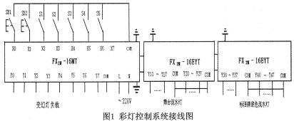 考虑输入信号较少,而输出负载多,选择PLC基本单元FX2N-16MT,可提供8输入8输出,另配置输出扩展模块FX2N-16EYT两台,由PLC基本单元供电。灯组均通过无触头开关模块控制。