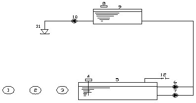 1上水箱。2下水箱。3上水箱水位传感器。4下水箱水位传感器。5上水箱供水泵A。6上水箱供水泵B。7 下水箱供水阀。8声光报警器。9排烟风机。10烟感和温感传感器。11 喷淋泵。12 喷淋头。