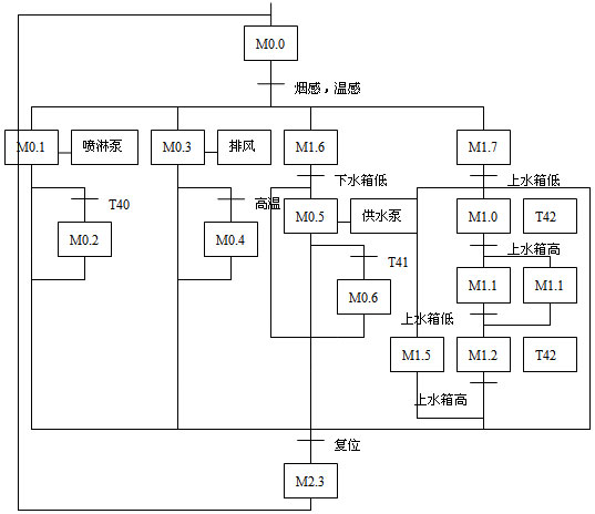 (2) plc控制打开排烟风机,当高温传感器发出高温信号时,说明此时火灾建筑物内不可能存在人员幸存,如果保持排风机开启只能增加火力,因此需要关闭排烟风机。