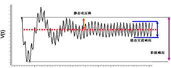 当芯片上的信号开始跳变时,如由0到1,电源网络的阶跃响应会如图6所示。最低电压值由芯片上的静态电容值与翻转电容值的比例决定,跳变后的谐振则为典型的LC谐振,静态电压降则是平均功率的体现,由网络中的寄生电阻导致。稳态的交流响应与工作频率相关,其波动的电压值随着工作频率的增加而减小。