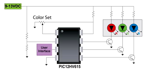 图中的PIC12HV615闪存微控制器整合了分流稳压器、提供8MHz时钟的振荡器、重设电路和模拟数字转换器,提供一个完整而灵活的单芯片解决方案。此闪存组件的电路内可程序化功能也允许在生产时执行颜色校准过程,从而为补偿各种发光器的性能差异和组件之间的差异提供了一种方法。