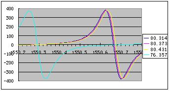 减小可控的温度范围,可缩短温度的稳定时间。图6说明在不同温度点,色散曲线随温度的变化。当温度每升高0.058℃时,色散曲线整体向长波漂移,对于ITU-T特定波长1550.52,在80.314℃时色散值为正,这时可以降低工作温度使曲线向短波漂移,使得该波长点的色散值为负,进而实现动态的色散补偿。