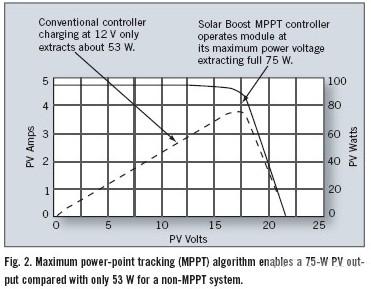 图2说明了典型的75W光伏模块在25℃电池温度下的传统电流/电压特性。虚线表示的是电压(PV VOLTS)与功率(PV WATTS)之比。实线表示的是电压与电流(PV AMPS)之比。如图2所示,在12V时,输出功率大约为53W。换句话说,通过将光伏模块强制工作在12V,输出功率被限制在约53W。