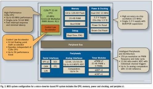 图3:面向基于微逆变器PV的系统的MCU系统包含CPU、存储器、电源及时钟、外设。
