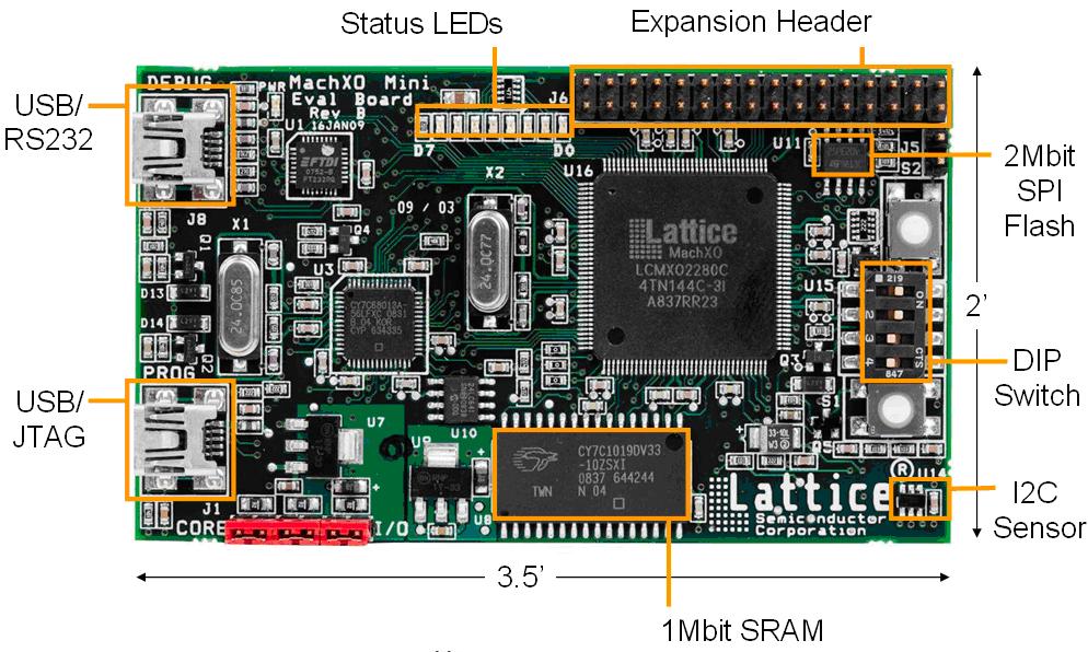 迷你开发板的中心是MachXO 2280非易失、基于闪存的拥有2280个LUT逻辑实现的可编程逻辑器件。图2展示了MachXO迷你开发板,并对主要接口加了注释。这个电路板提供五种主要的功能: