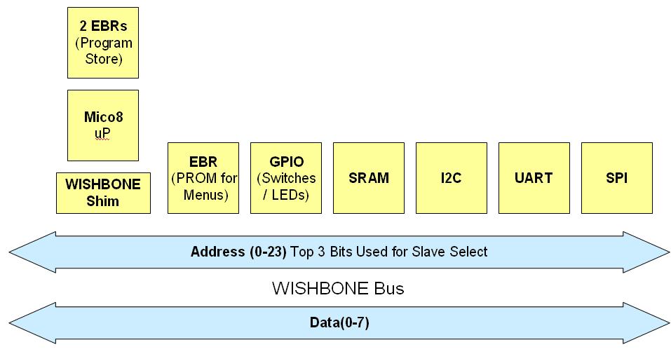 其他的EBR存储器连接到Wishbone总线。这个EBR配置成1024深度 8位字节。针对通过RS232接口的Mico8显示的各种菜单,存储空间是用来共享数据。