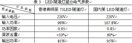 但是,目前国内LED隧道灯市场上对功率因数、谐波等电气参数的控制还存在良莠不齐的问题。表3给出了两款LED隧道灯的部分电气参数。从表中数据看出,香港真明丽75LED隧道灯的谐波含量符合要求,而国内某LED 隧道灯的谐波含量则不符合要求。