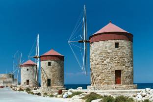 图1:希腊罗德港内的风车 – 做成转子旋翼的布已被卷起