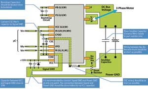 与电压源变频器的分立元件方案类似,采用智能功率模块时也要注意外部元件的布局安排。图3所示为针对Motion-SPMTM应用的一些建议。由于电压源变频器的开关速率很快,信号接地和功率接地必须分开。两种接地在15V Vcc电容处互接。Vcc电容和功率接地之间的通道要狭窄,以去除耦合。为防止电涌造成破坏,引脚P与功率接地之间应当有一个低电感电容。另外,由于电压源变频器和马达之间的长引线会造成高压反射,因此一些SPM产品配备了外接栅极电阻来调节开关速率和最大限度地减少反射。