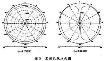 为了降低过载试验台和房顶的发射波能量,发射天线采用柱状单极子天线,其方向图如图5所示。该种天线的方向图在水平剖面表现为均匀的方向性,有利于过载台在高速旋转时遥测信号稳定接收;在垂直方向上,上下方向各有一个较深的零陷,有利于抑制发射信号在试验台和房顶形成的反射波,降低多径衰落的影响。