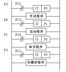 手动、自动、单步、车螺纹程序的选择采用跳转指令实现。图3是总程序结构框图。若合上X12(X13、X14、X15断开),其常闭断开,执行手动程序;若X12断开,X13全上,程序跳过手动程序,指针到P0处,执行自动程序。
