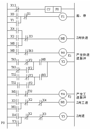 在执行手动程序状态下,按X0,Y1接通,作好起动准备。按X2,辅助继电器M0接通。通过T63计时及Y2触点组合,产生频率为103/2i的脉冲信号(i为计时时间,根据需要设定,单位为ms),驱动Z向快进。当按下X3时(M0断开),M1接通,M1与定时器T32组合使Y2产生频率为103/2j 的脉冲(j>i),由Y2输出,实现工进。按下X4时,M0、Y3同时接通,电机快速反转,实现快退。限于篇幅,其它程序梯形图略。