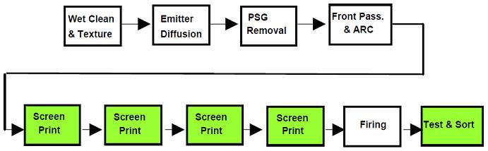 表1:晶体硅太阳能电池的制造需要进行多次丝网印刷步骤。应用材料公司Baccini产品可以帮助实现绿色框中的步骤。