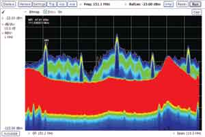 图 7使用数字荧光处理(DPX)技术考察DUT的EMI特性,立即发现问题。泰克公司实时频谱分析仪独有的DPX频谱显示技术每秒可以处理超过48000个频谱,保证能瞬时捕获和显示持续时间超过几十微秒的信号。在图6中,发生频次较高的信号用红色表示,发生频次较低的信号用蓝色和绿色表示。这样,可以立即看到哪些信号是连续的,哪些信号是瞬态的。瞬态信号偶尔出现,但其电平要比连续信号高出15dB。