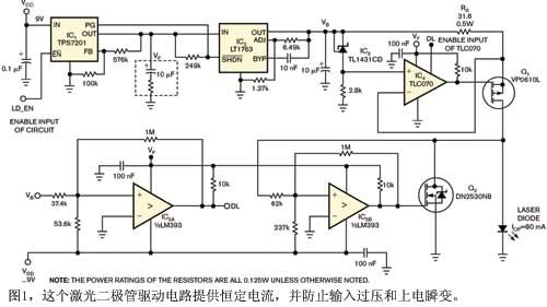 在精密仪器应用中,连续波激光二极管的驱动需要恒流源。要正确设计这种驱动器必须小心处理健壮性、稳定性、噪声与其它问题,因而成本高且复杂(参考文献1)。图1给出了一个紧凑型阴极接地激光二极管驱动器,它能防止ESD(静电放电)损坏、上电尖峰、过冲,以及可能由于外部光反馈所致的波动。带使能输入的运算放大器IC4驱动PMOSFET Q1,并控制输出电流。使用Opnext的35mWHL6738MG激光二极管,RS将电流设定在额定值。为防备上电期间来自Q1的输出,比较器IC5A使IC4关断,一只10kΩ的上拉电阻将Q1栅极接到IC4的电源,使Q1关断,当端子电源VB达到所需约6.5V时,通过IC4打开Q1。