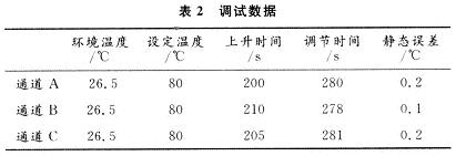 通过实验测量,被控对象的纯滞后时间为20 s左右,因此选择采样周期为2 s。通过实测数据比较,选择控制度为1.2,采用PI控制,经过对参数进行微调,最后得出最佳PID参数,即KP=2.11,K1=0.043。在系统调试中实测数据表明,控制器平均控制精度在士0.2℃之内。表2为调试过程中3个通道的1次数据记录。从数据可以看出,当设定温度为80℃时,最后稳定温度为80.2℃,控制精度比较高。