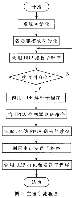 主程序主要完成单片机和各个功能模块的初始化、对各个功能模块的调用以及对FPGA控制器的控制。由于篇幅关系,只给出主程序的流程图,如图5所示。