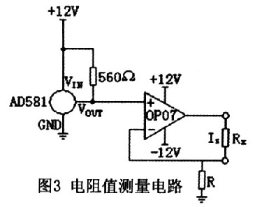 但实际使用中发现,恒流效果并不理想,究其原因是运算放大器正相输入端电压的稳定性不好造成的。解决的办法是利用高精度的恒压源AD581输出稳定电压作为运算放大器正相输入端电压,有效地提高了恒流效果,最终的电阻值测量电路如图3所示。