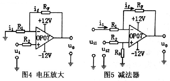 为了把电阻式位置传感器输出的电压信号转换成-5V~5V范围送入数据采集卡,以满足计算机检测的需要,还需要利用运算放大器OP07设计电压放大器、电压跟随器和减法器组成调理电路。