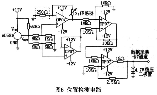 X2位置检测电路如图6所示,AD581输出的+10V稳定电压经过电阻分压产生+1V的基准电压,根据式(4)将电阻(图6中虚线框电阻)选择为250Ω将会形成4mA的恒定电流。若传感器(图6中的X2)的阻值范围是0~2kΩ,所以4mA恒定电流流过传感器产生0~8V的电压,再加上1V的基准电压,送入由运算放大器OP07制作的减法器的正相输入端是1v~9V范围的电压。另外,AD581输出的+10V稳定电压经过电阻分压产生+5V的电压经过电压跟随器送入减法器的负相输入端。根据减法器的原理,其输出电压范围在-4v~4v,该电压通过放大倍数为1.25的放大器最终形成-5V~5V范围的电压信号,经过稳压二极管限压后,送入数据采集卡的7通道。