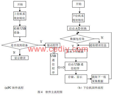 采集系统的主要功能是采集各模拟量输入通道的数据 ,并将收到的信息进行存储。程序结构分为主程序和中断程序 ,其中包括初始化、信号的采集和数据处理显示输出。初始化包括定时器、终端系统、工作状态和 USB接口的初始化等。系统每隔 20ms采集一次信号 ,保证对信号有很好的跟随性。在下位机固件程序中 ,在设备接入主机后 ,首先对下位机进行系统初始化,然后进行 USB连接,被主机识别并能正常驱动,进入正常使用状态,等待数据传输。如果有 PC数据传输,则调用通讯模块接收数据,并将数据存入下位机存储器,然后调用读数据模块与显示模块进行显示;否则直接执行读数据模块并调用显示模块进行显示(显示上次存储的数据)。系统软件的流程图如图4所示。