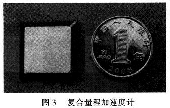 在被测量物理量随时间变化的情况下,加速度计的输出能否随输入量变化良好是一个很重要的问题。以上通过分析复合量程加速度计的动态特性,得到其理论频响特性。以下对封装完成的复合量程加速度计进行动态测试,图3为封装后复合量程加速度计(图中右边的硬币用以对比其大小)。