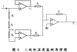 在温度监测时,见图6,采用热电阻的三线接法来监测温度,这样可以消除导线电阻RL引起的监测误差,使监测结果更精确。测得Rt如下:
