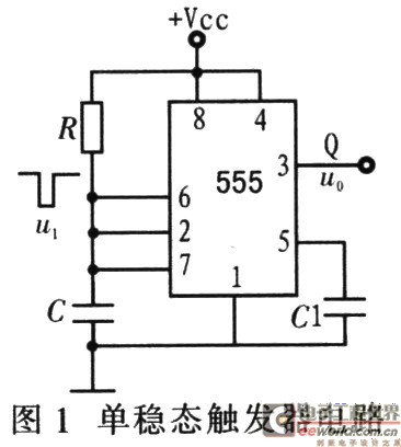 电路中只有一种稳定工作状态的触发器叫做单稳态触发器,其特点:在无外加触发信号作用时,电路处于一种稳定工作状态,称为稳态;当输入端有外加触发脉冲信号的上升沿或下降沿(由电路而定)作用时,输出状态立即发生跳变。电路进入暂时稳态状态,称为暂稳态。电路自动恢复原先的稳态,其暂稳态时间与电路阈值电压及外接R、C参数有关。按电路结构,单稳态触发器可分为微分型和积分型两种。前者适用于窄脉冲触发,后者适用于宽脉冲触发。无论哪种电路结构,其单稳态的产生都源于电容的充放电原理。图1为用555定时器组成的单稳态触发器电路。