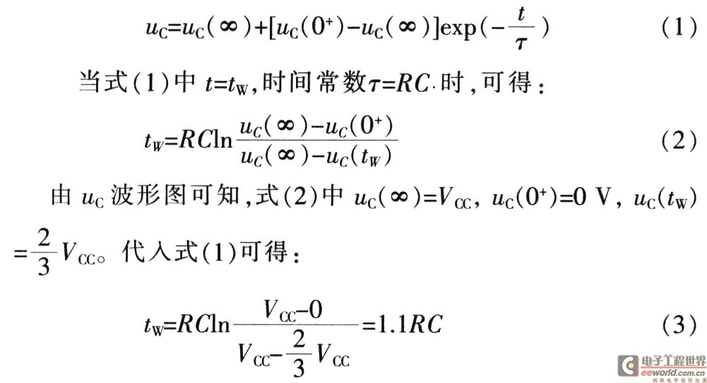 输出u0的脉冲宽度tW也就是暂稳态的持续时间,可根据uC的波形计算。根据RC电路瞬态过程的分析,可得到: