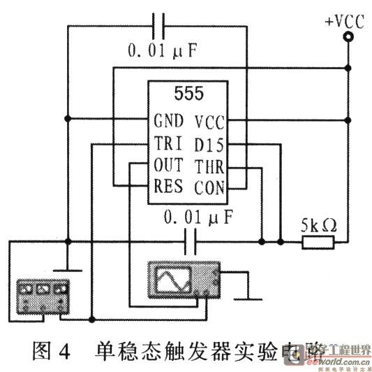 用555定时器组成的单稳态触发器,图2为其波形图。图中,t0~t1为稳态,t1~t3为暂稳态,t3时刻恢复稳态。