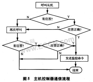 主机控制器的通信软件实现功能主要包括呼叫各从机(下位机),并向各从机发送查询控制命令。其工作过程为:控制器发送需呼叫的从机的地址,然后等待接收从机的应答信号,若应答信号正确即发送控制命令,若应答信号不正确则重新发送需呼叫的地址,并等待接收应答信号,接收到应答信号后接收下位机发送的数据,存储在相对应的数据存储区并在LCD(液晶显示器)显示屏中显示出来。对同一从机多次呼叫而在规定时间内无应答信号或应答信号不正确,则提示错误信息。图5为主机控制器通信流程图。