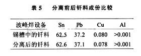 另外日本及香港的厂家推出了靠机械搅拌作用分离的锡渣分离器,其分离出的钎料成份与原成份几乎相同,见如表5。国内某厂家牛产了依靠化学作用的锡渣还原机,据报道其还原率达80%以上。这种回收设备属于离线还原处理,适用于氧化渣产生量较多的大公司。