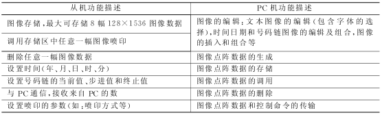 响应键盘操作,实现人机对话,包括设备参数的设置,图像数据的删除,图像数据的调用和喷印,设备与PC通信启动按键。选择“设备与PC通信启动”按键,系统进入通信状态。选择“喷印”按键,系统进入喷印状态。