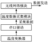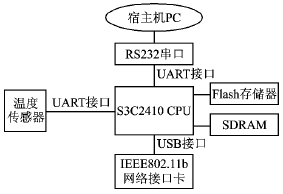 从外部温度传感器采集到的数据经S3C2410 CPU数据处理模块传回到IEEE802.11b USB接口卡;IEEE802.11b的无线通信模块经IEEE802.11b的接入点传到外部以太网络中。