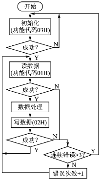 ① 初始化设备功能,发送03H给温度变送器。如果初始化失败,则重复发送初始化功能码2次,若都失败则返回;若成功则进入下一步。