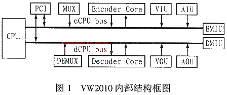 (1)片内集成有3个信号处理/控制单元,包括一个视频编码(压缩)器、一个视频解码(解压)器和一个片内CPU(内部扩展一个音频编码DSP、一个音频解码DSP、一个多路复合单元和一个多路解复合单元)。VW2010芯片的内部结构图如图1所示。